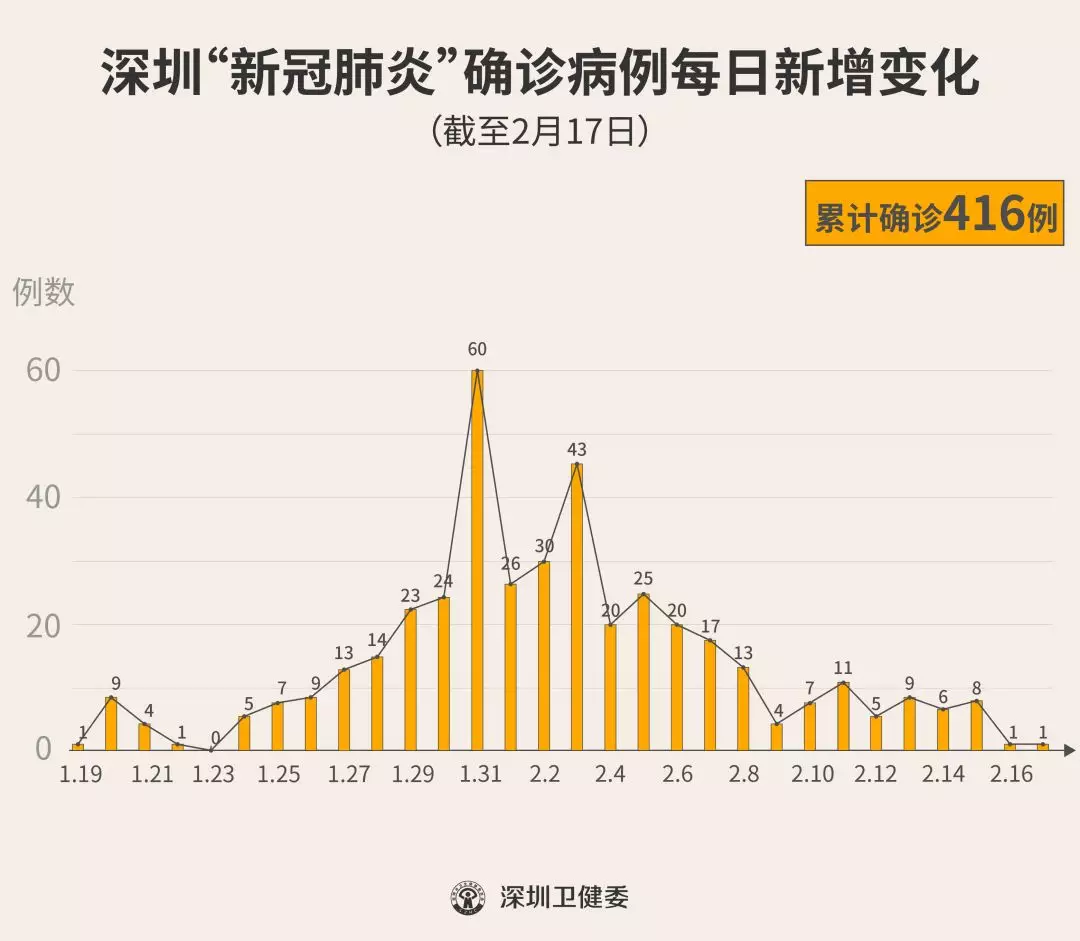 截至2月17日24時,深圳累計(jì)報(bào)告“新冠肺炎”確診病例416例。2月17日當(dāng)天全市新增確診病例1例(個案詳情今晚公布)。