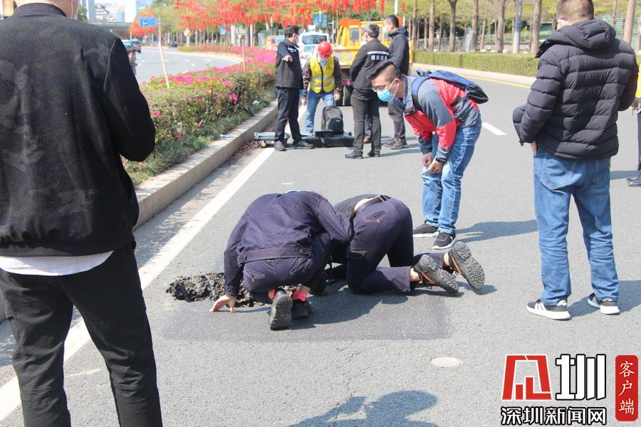 上午10點40分,記者在現(xiàn)場看到,該路面有一個直徑約一米、深約一米的坑口,旁邊還有一道長約20米的裂痕。工作人員正在使用雷達儀器對地面情況進行勘測,同時該路段及靠深南大道一條車道已暫時被封鎖,福田區(qū)交警大隊也在現(xiàn)場指揮交通。據(jù)悉,該位置較臨近的地鐵2、3路線的站點,一位深圳地鐵的工作人員告訴記者,目前該事故沒有對其線路運行造成影響,也非先前修挖地鐵所致。
