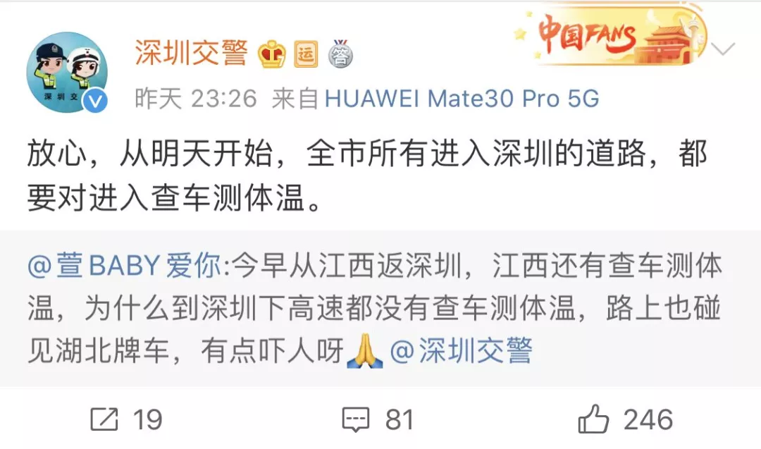 深圳交警表示,全市所有進(jìn)入深圳的道路都要對進(jìn)入的車輛查車測體溫。