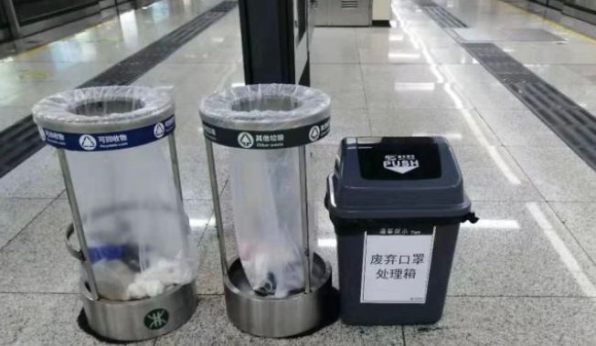 深圳地鐵設(shè)置廢棄口罩回收桶,在所轄7條線路的200多個車站共投放547個專用垃圾桶,用于回收廢棄口罩等各類防護(hù)用品。
