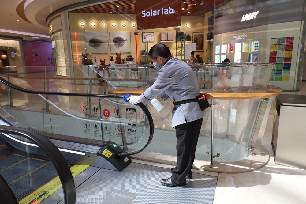 走在商場中,隨時(shí)可以看到保潔人員在消毒清潔。在商場一樓中庭導(dǎo)購屏和導(dǎo)購機(jī)器人處,保潔人員用消毒水反復(fù)擦拭屏幕。據(jù)悉,商場每小時(shí)巡回對(duì)扶梯、電梯、衛(wèi)生間、消防通道、導(dǎo)視屏、扶手欄桿、休閑椅、門把手、垃圾房、垃圾桶等地進(jìn)行消毒。