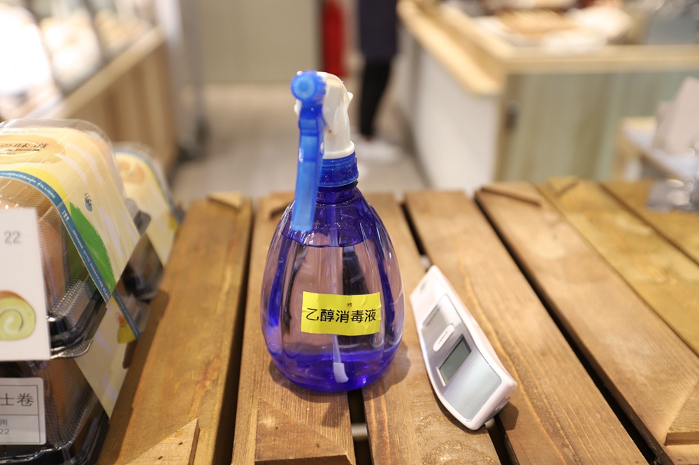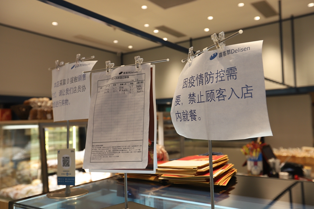 負(fù)二樓的喜薈萃是一家剛開業(yè)沒(méi)多久的面包店,記者看到里面燈光明亮、各式面包充盈貨賀,進(jìn)店的通道已全部攔堵,并設(shè)置了取餐及消毒區(qū)。一名市民正在選購(gòu)面包,他站在店外選好款式后,店員將面包打包好并放在取餐處,市民掃碼付款后就可以帶走了。這就是商場(chǎng)內(nèi)實(shí)行的“零接觸”購(gòu)物。