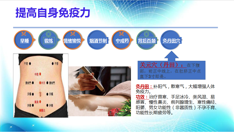 7.灸丹田穴:丹田在下腹部,前正中線上,在肚臍正中點(diǎn)直下3寸即是。灸丹田穴可以補(bǔ)陽氣,散寒氣,大幅增強(qiáng)人體免疫力。