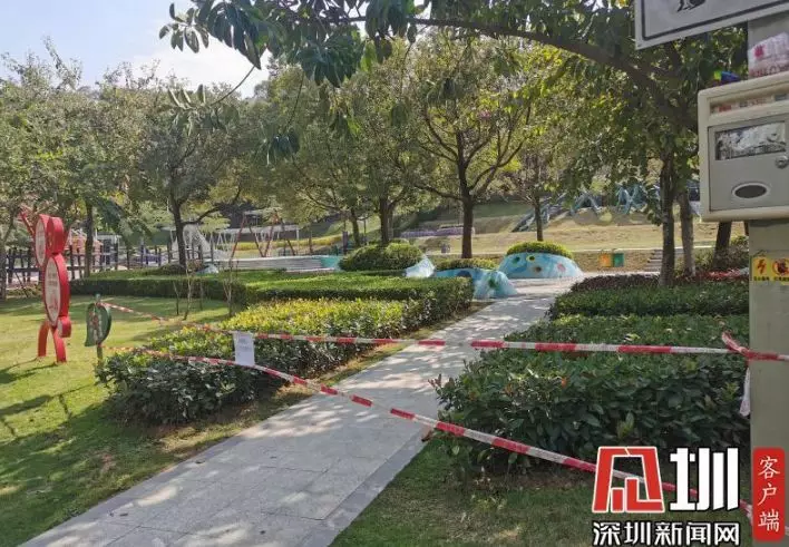 在光明區(qū)新城公園,記者看到公園里游樂設(shè)施區(qū)域已被封,暫未對外開放。道路兩旁的小喇叭正播放著防疫宣傳廣播,提醒市民出門戴好口罩,勤洗手,注意防護。
