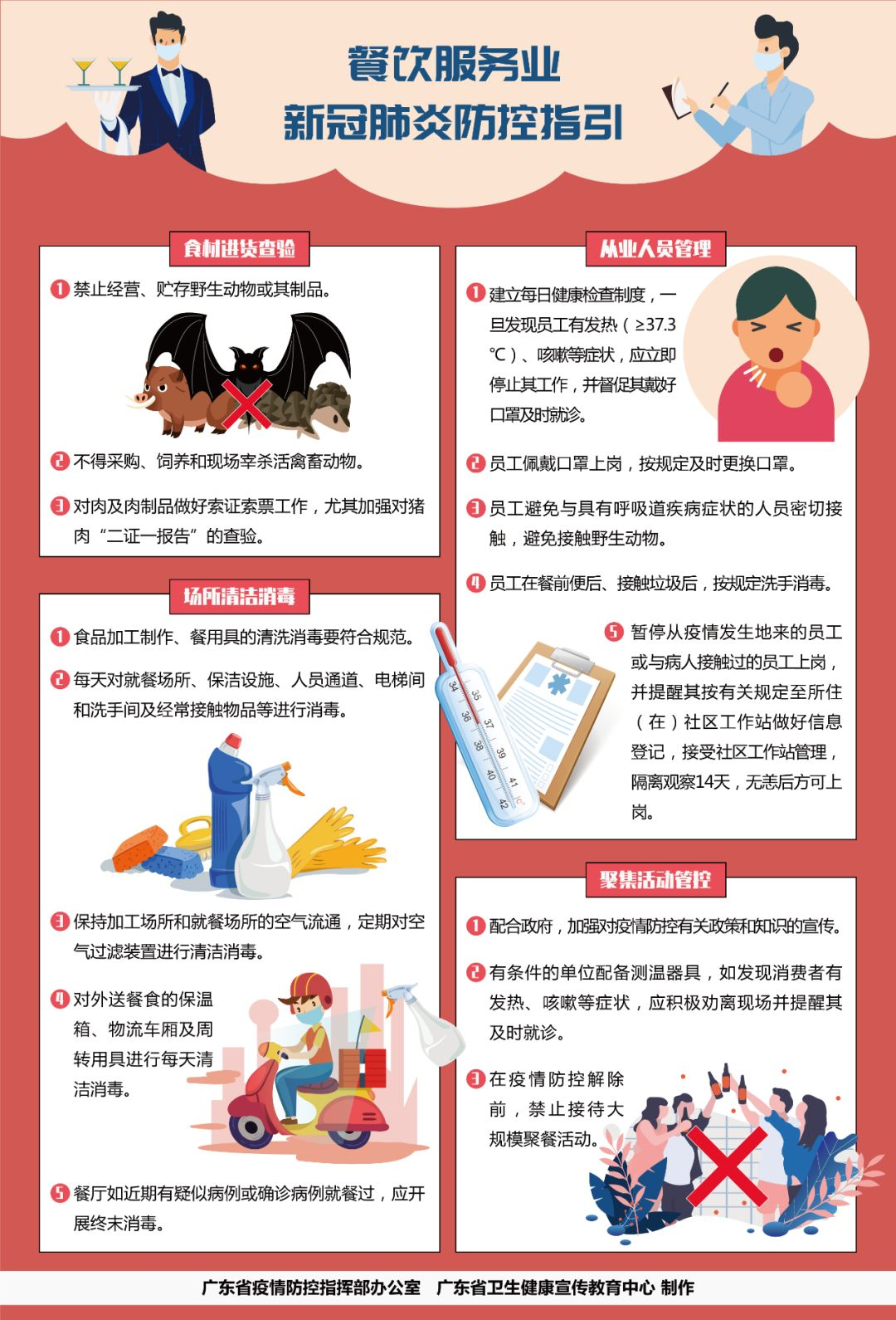 1、嚴(yán)格按照《機關(guān)、企業(yè)及工廠節(jié)后復(fù)工防控新型冠狀病毒肺炎工作指引》(粵衛(wèi)疾控函〔2020〕14號)、《餐飲服務(wù)食品安全操作規(guī)范》要求以及國家衛(wèi)生健康委員會《新型冠狀病毒感染的肺炎防控方案》《新型冠狀病毒感染的肺炎公眾防護(hù)指南》等防控要求,建立健全防控制度,壓實防控責(zé)任,嚴(yán)格從業(yè)人員管理,杜絕從業(yè)人員帶病上崗。