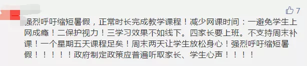 一些參與者留言建議減少或暫停網(wǎng)課時間,縮短周末或暑假時間進行補課。