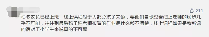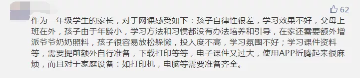 雖然網(wǎng)課兩端是老師和學(xué)生,但家長的參與也必不可少。部分參與者認(rèn)為,如果沒有家長的有效監(jiān)管,網(wǎng)課很難保證教學(xué)質(zhì)量,而大部分家長已經(jīng)復(fù)工,無法時刻盯著孩子。有些家長晚上下班后還要監(jiān)督孩子上網(wǎng)課、做作業(yè),實(shí)在“費(fèi)時、費(fèi)力、費(fèi)神”。讓孩子自己上網(wǎng)課,有些“連作業(yè)是什么都不清楚”。還有些孩子利用上網(wǎng)課的空檔玩游戲,甚至“從十七號開始到現(xiàn)在玩游戲超過1萬塊”。