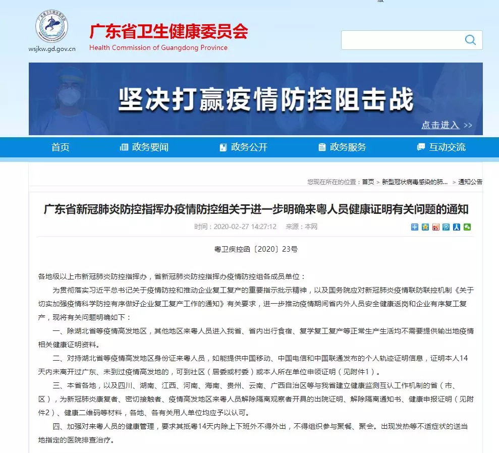 廣東省新冠肺炎防控指揮辦疫情防控組關(guān)于進一步明確來粵人員健康證明有關(guān)問題的通知