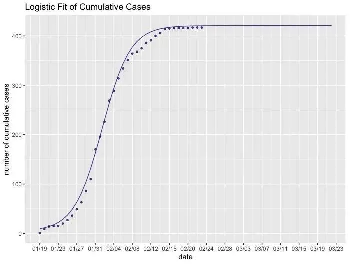 進一步地擬合深圳新冠肺炎的累計確診人數(shù),并對累計確診人數(shù)做出預(yù)測??梢钥吹剑P皖A(yù)測自2月28日起病例數(shù)不再增加,預(yù)測得到最終的累計確診人數(shù)收斂在422人左右。