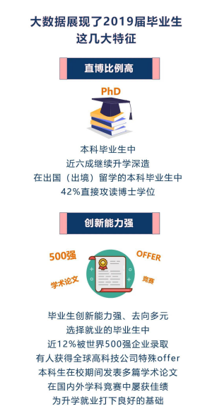從本科畢業(yè)生升學情況來看,有超六成同學選擇了境外留學,其中四成為直博。在2019屆畢業(yè)生里,直博人數為144人,占全體畢業(yè)生近20%。