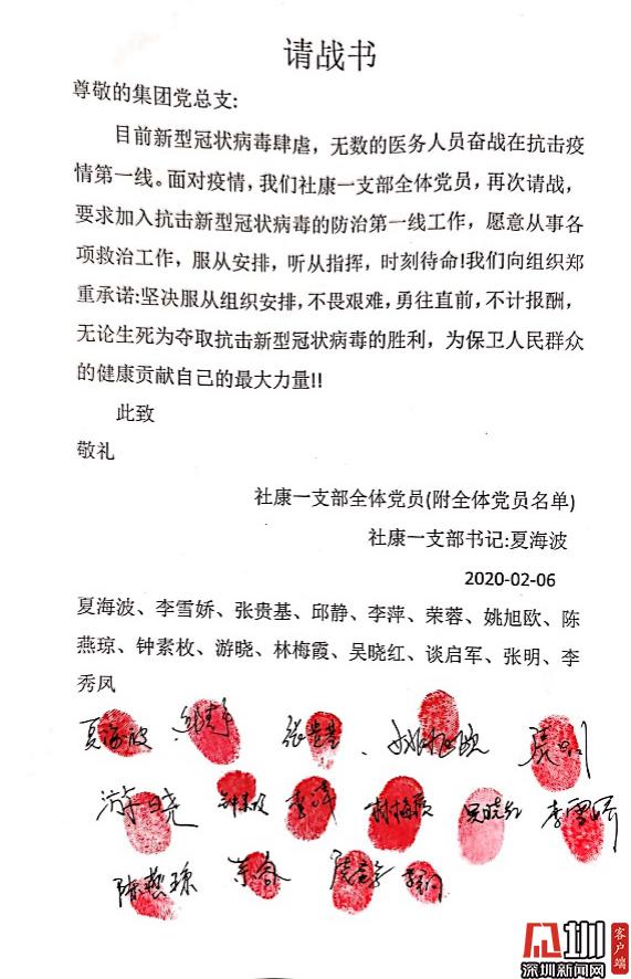 “我是共產(chǎn)黨員,我請戰(zhàn)!愿為戰(zhàn)勝疫情全力以赴!”這是南山區(qū)醫(yī)療集團(tuán)總部一支部13名黨員和2名入黨積極分子聯(lián)名撰寫的《請戰(zhàn)書》(節(jié)選)。
