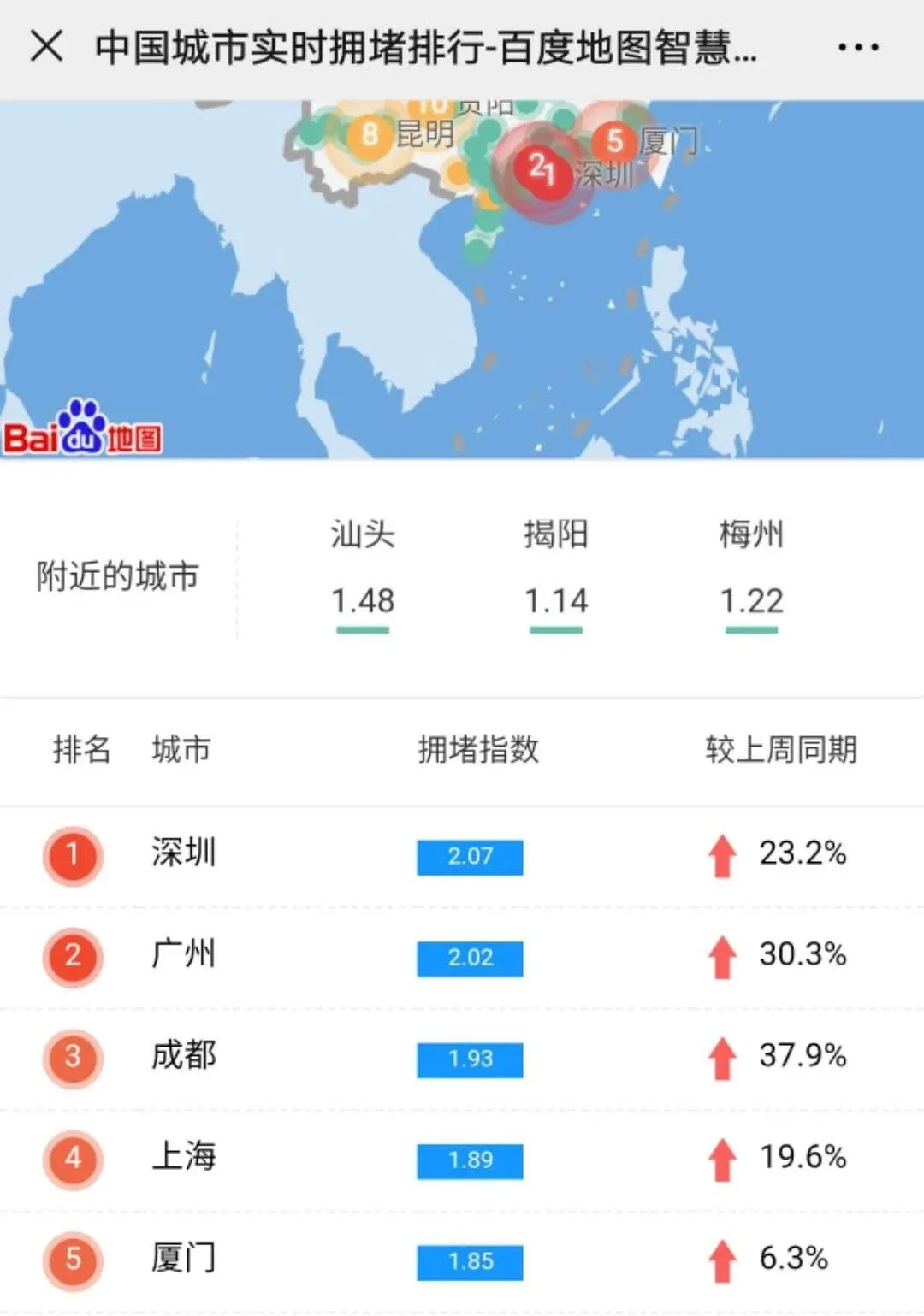 據(jù)百度地圖提供的中國(guó)城市實(shí)時(shí)擁堵排行來看,3月2日19時(shí)許,深圳擁堵指數(shù)為2.07,位居全國(guó)榜首。