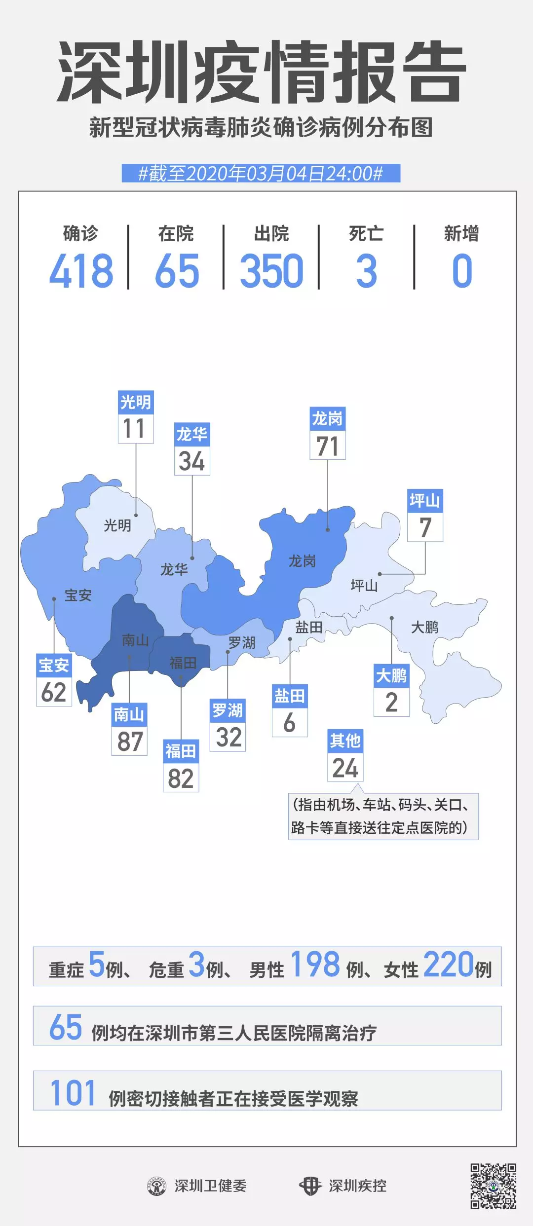 按照病例管理地區(qū)劃分,南山區(qū)87例、福田區(qū)82例、龍崗區(qū)71例、寶安區(qū)62例、龍華區(qū)34例、羅湖區(qū)32例、光明區(qū)11例、坪山區(qū)7例、鹽田區(qū)6例、大鵬新區(qū)2例、其他(指由機(jī)場(chǎng)、車(chē)站、碼頭、關(guān)口、路卡等直接送往定點(diǎn)醫(yī)院的)24例。