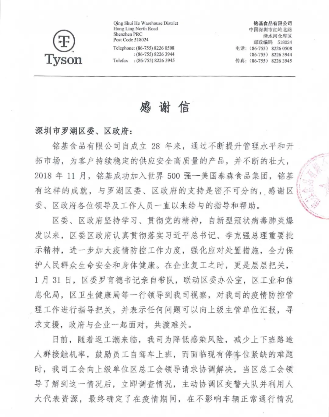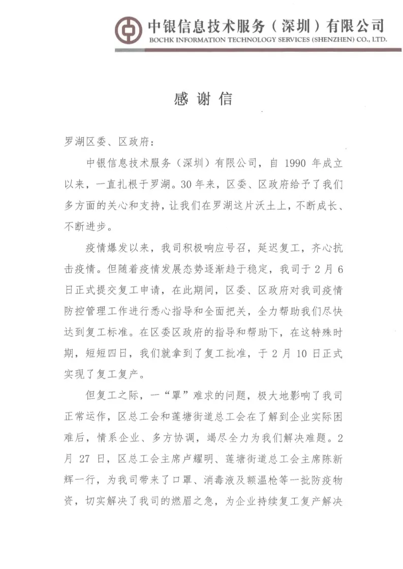 中銀信息技術服務(深圳)有限公司、銘基食品有限公司在復工復產(chǎn)后都遇到了一些困難,羅湖工會了解了他們的情況后,主動發(fā)揮工會作用,幫企業(yè)解決困難,協(xié)助他們順利復工復產(chǎn)。近日,兩封感謝信送到了羅湖區(qū)委、區(qū)政府,向羅湖羅湖區(qū)委、區(qū)政府以及羅湖各級工會為企業(yè)的付出表示感謝。