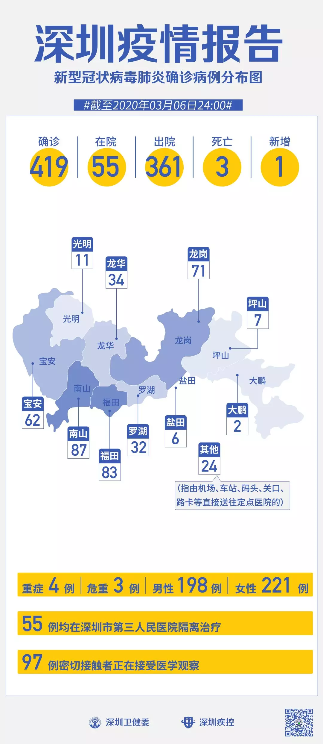 按照病例管理地區(qū)劃分,南山區(qū)87例、福田區(qū)83例、龍崗區(qū)71例、寶安區(qū)62例、龍華區(qū)34例、羅湖區(qū)32例、光明區(qū)11例、坪山區(qū)7例、鹽田區(qū)6例、大鵬新區(qū)2例、其他(指由機(jī)場(chǎng)、車站、碼頭、關(guān)口、路卡等直接送往定點(diǎn)醫(yī)院的)24例。