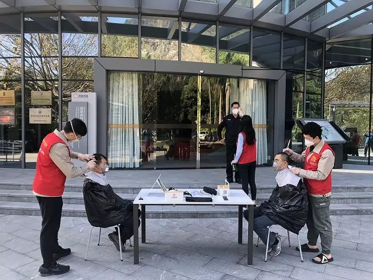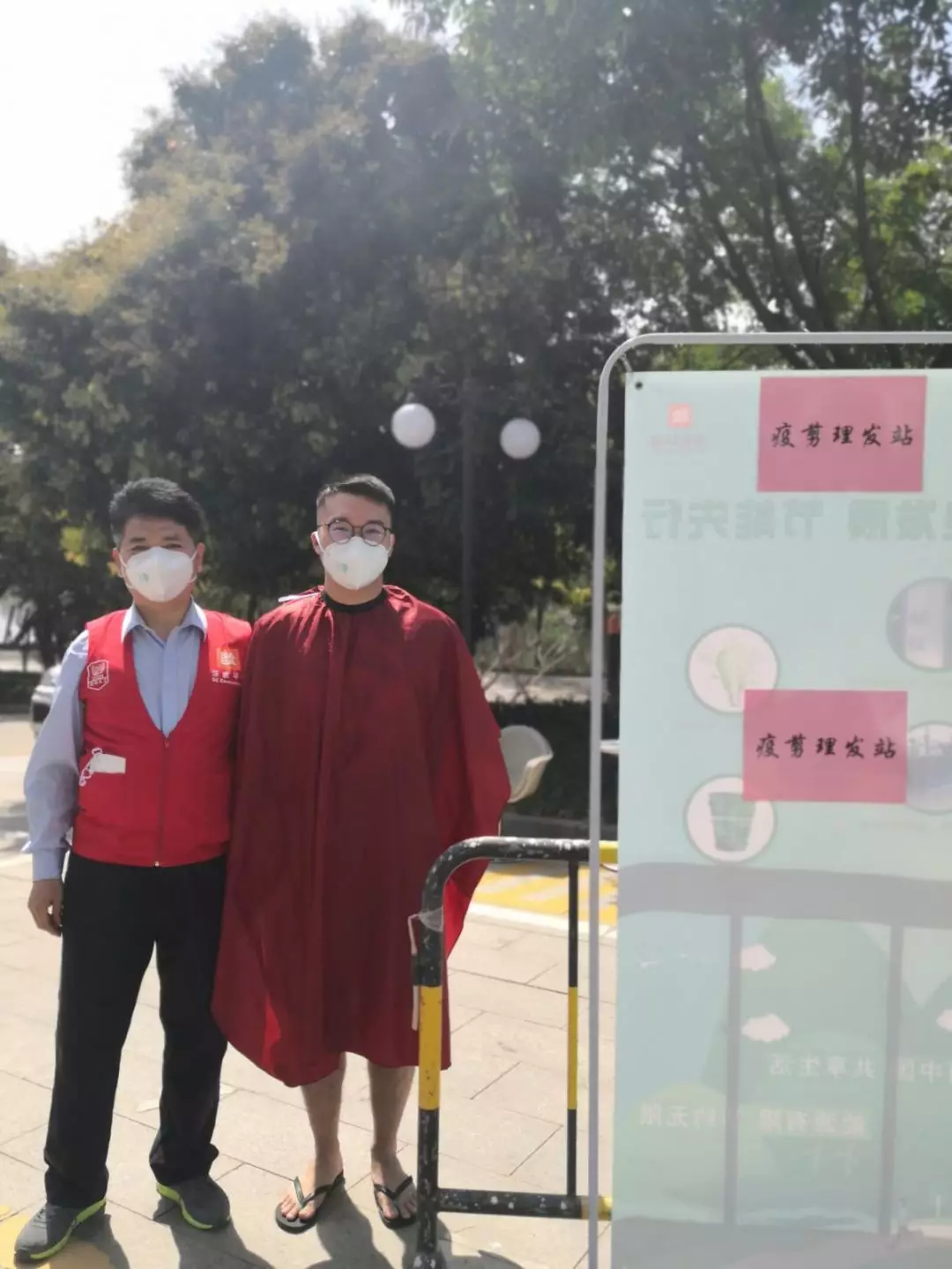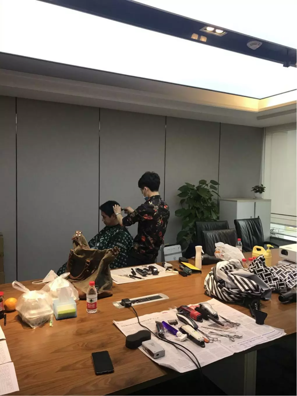 公司本部,1303會議室,臨時理發(fā)室“生意”也火爆極了。公司工會邀請了兩名專業(yè)的Tony老師,為近90名員工提供免費的理發(fā)服務(wù)。為減少人員聚集,理發(fā)采取提前線上預(yù)約,分時段進(jìn)行,確保安全的同時,盡可能讓有需要的同事都能理上發(fā)。鋪上一次性地毯,坐上椅子,圍上一次性“斗篷”,Tony老師一頓熟練的剪發(fā)操作后,再用吹風(fēng)機整好造型,就完成了理發(fā)的全過程。臨時理發(fā)師的搭建,有效解決了員工生活上的困難,幫助他們以良好的精神面貌投入工作來。