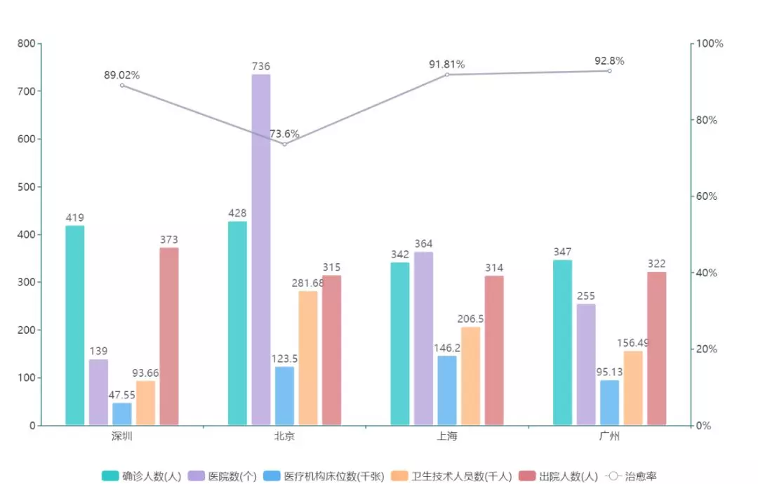 ▲對比北京、上海、廣州等城市,深圳的醫(yī)院數(shù)、床位數(shù)及衛(wèi)生技術(shù)人員數(shù)量都處在第四位,醫(yī)療資源現(xiàn)有儲備略顯不足,勢必給疫情防控過程中的患者救治工作帶來嚴峻考驗。