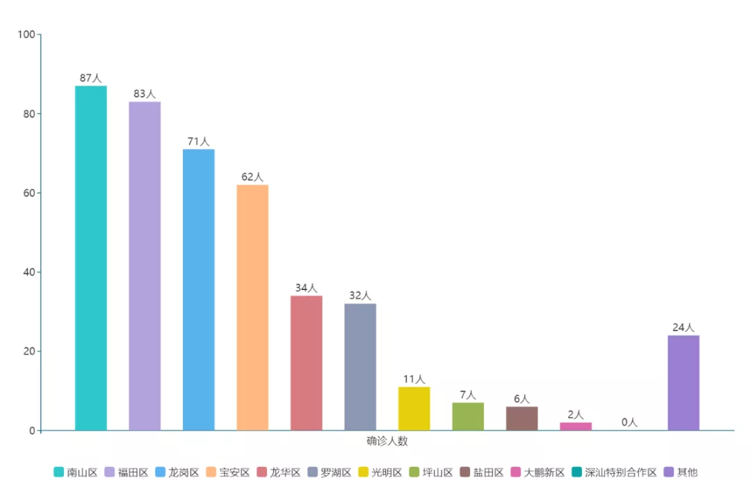 ▲按照區(qū)域劃分,已公布的確診病例中,南山區(qū)87例、福田區(qū)83例、龍崗區(qū)71例、寶安區(qū)62例,為患者較多的幾個區(qū),與其人口較多、經(jīng)濟發(fā)達有關(guān)。深汕特別合作區(qū)暫未出現(xiàn)病例。
