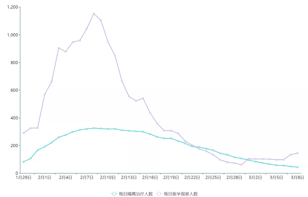 ▲自2月3日起,深圳每日都有新冠肺炎確診病例達到出院標準,截至3月8日24時,累計出院病例達到373例,治愈率達89%,高于全國72.6%的治愈率,治療方案取得明顯成效。另外,2月8日之后,每日醫(yī)學觀察人數(shù)保持低位并處于總體下行區(qū)間。