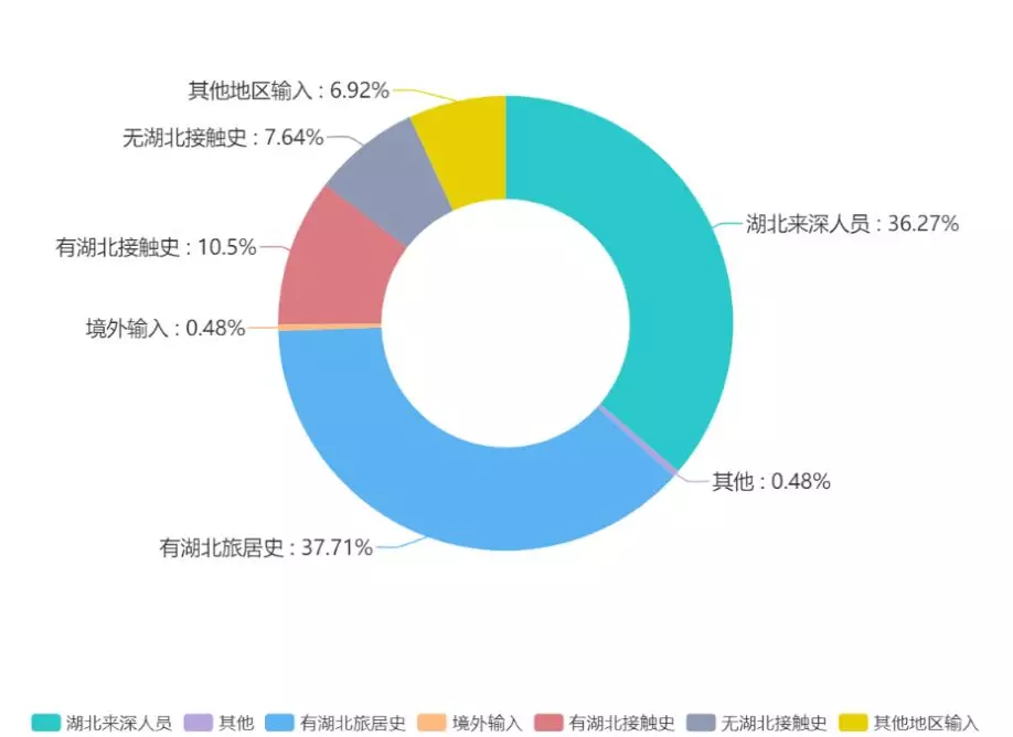 ▲所有輸入型病例中,近六成與湖北武漢有關(guān)聯(lián),湖北省其他城市也為重點來源地區(qū)。可見,對湖北來深人員、有湖北旅居史人員的管控工作是防疫工作的重要一環(huán)。