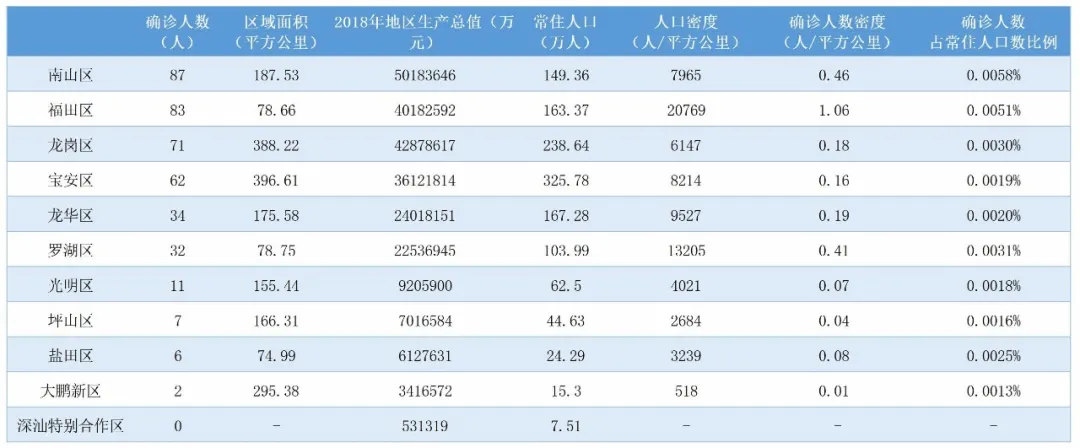 ▲很明顯,人口稠密地區(qū)確診病例較多,福田、南山、羅湖確診人數(shù)在單位面積中密度高;南山、福田兩區(qū)確診人數(shù)在總?cè)丝跀?shù)當中占比高。