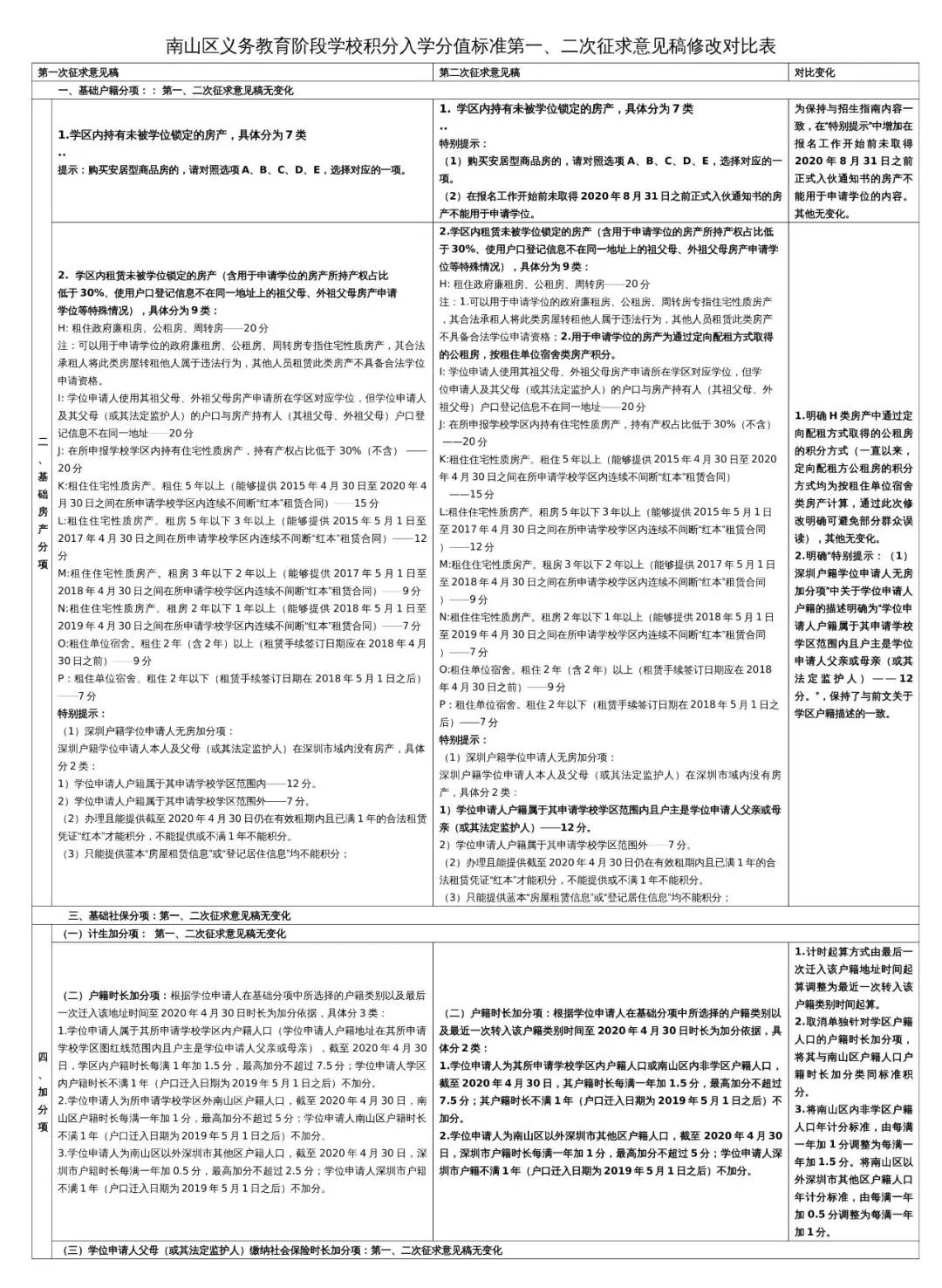 1月19日,南山區(qū)教育局第一次征求意見發(fā)出后,共收集到關(guān)于積分算法調(diào)整的反饋意見182條,并于2月10日第二次發(fā)布《南山區(qū)義務(wù)教育階段公布學(xué)校積分入學(xué)實(shí)施辦法》征求意見稿(以下簡稱《意見》),根據(jù)《意見》內(nèi)容,擬調(diào)整2020年積分入學(xué)辦法。