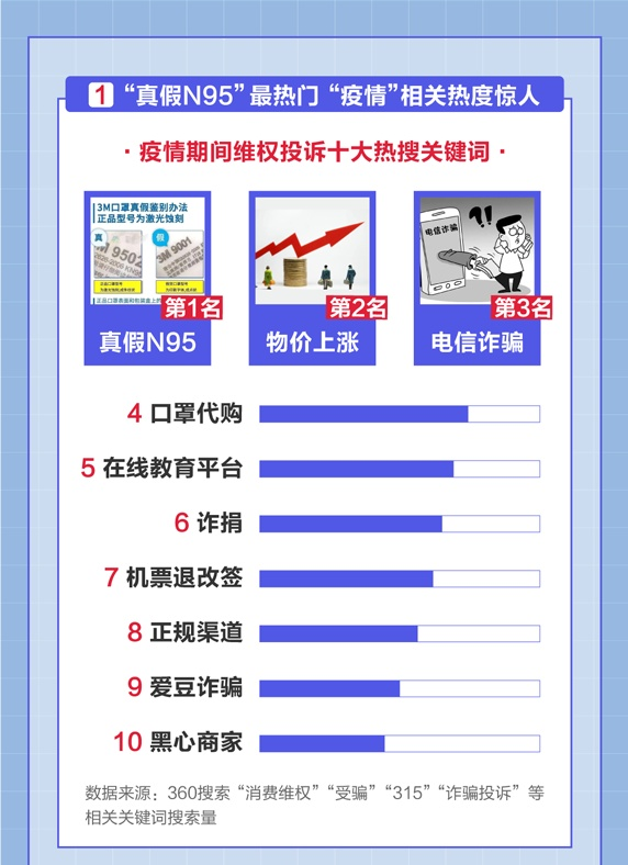 深圳商報2020年3月15日訊 360搜索、360瀏覽器今日發(fā)布《315消費者維權(quán)數(shù)據(jù)報告》(以下簡稱《報告》)。報告顯示,“真假N95”、“口罩代購”等與口罩質(zhì)量相關(guān)的訊息成熱議話題。