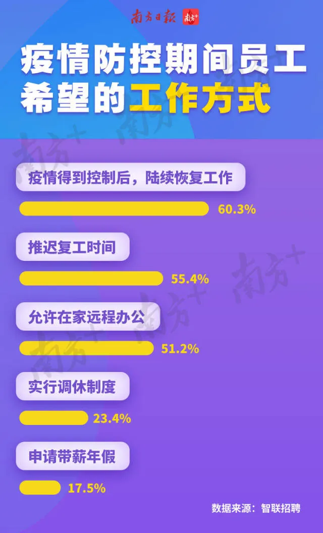 其中,60.3%的職場人希望疫情得到控制后再陸續(xù)復工,盡管這種理想狀況可能性不大,也有55.4%的職場人希望推遲復工時間,51.2%的職場人呼吁遠程辦公。