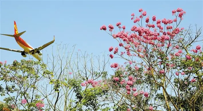 寶安航城街道機(jī)場南路兩旁,風(fēng)鈴木花綻放。