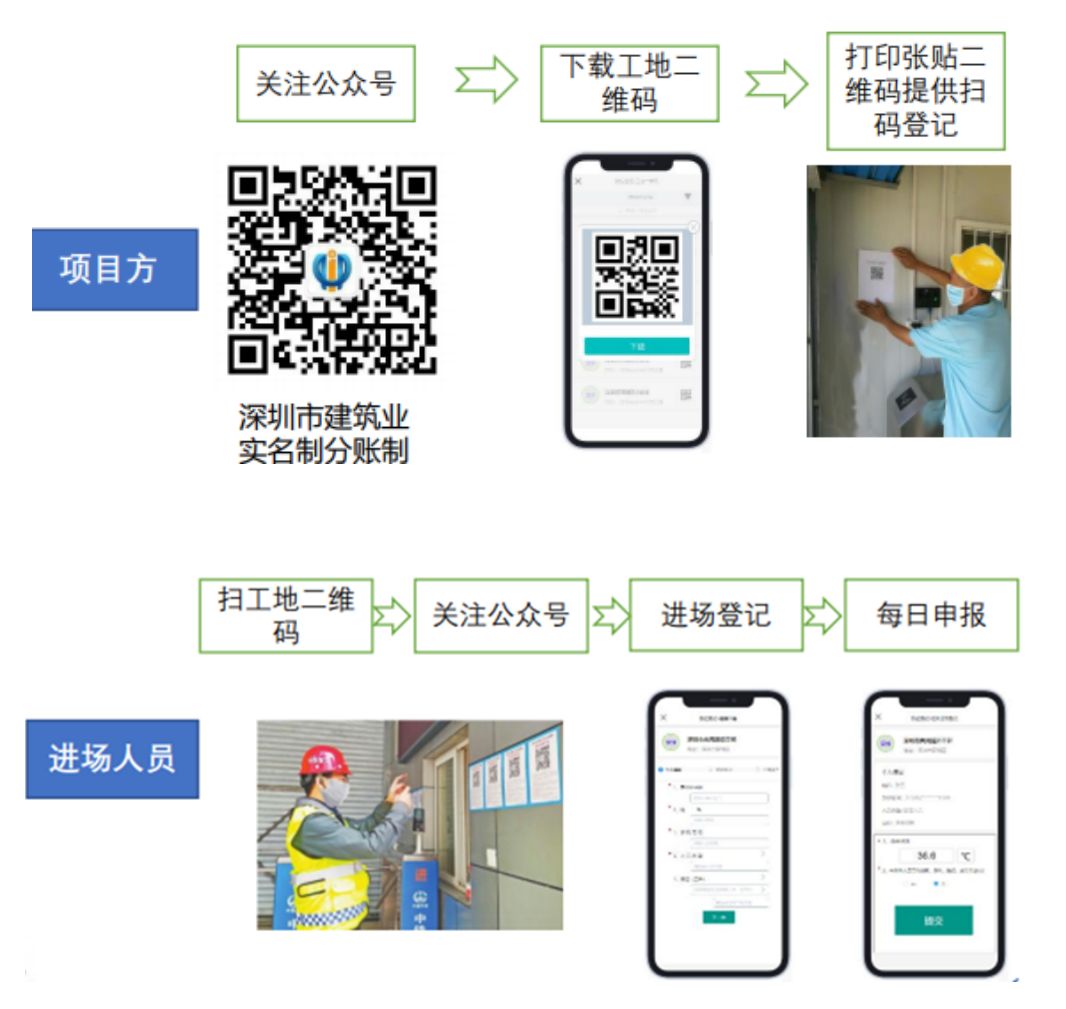 市場建設(shè)單位應(yīng)關(guān)注深圳市建筑業(yè)實(shí)名制分賬制微信公眾號,獲取本工地的微信二維碼,并將工地二維碼張貼至工地公示區(qū)域。施工人員每日進(jìn)場前測溫后,掃碼申報個人測溫結(jié)果和健康狀況。