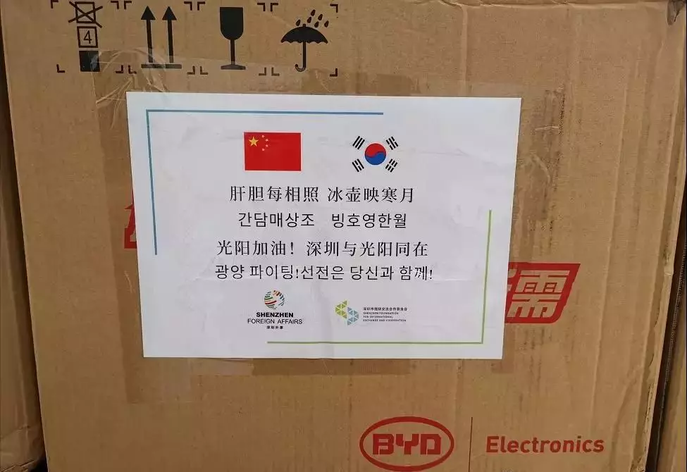在韓國(guó)光陽寄來深圳的物資箱上,寫著“心相通,民相親,天涯咫尺間”。而在深圳此次寄出的物資箱上,也深情引用了韓國(guó)詩人許筠的一句詩:“肝膽每相照,冰壺映寒月?!?/p>