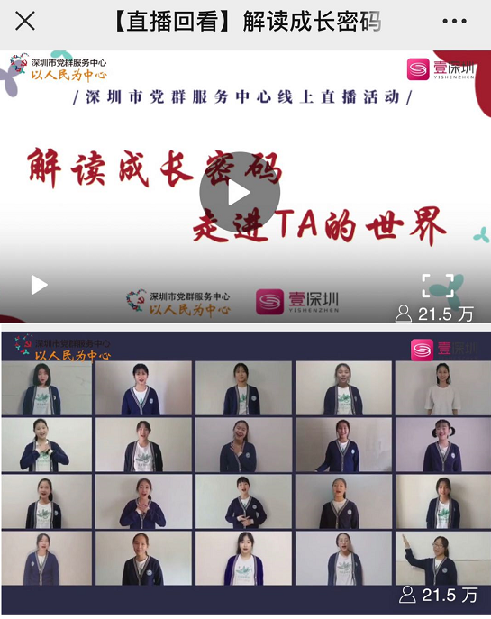 見(jiàn)圳客戶端、深圳新聞網(wǎng) 2020年3月19日訊(記者 陳彬) 3月15日下午,中共深圳市委組織部和深圳廣播電影電視集團(tuán)聯(lián)合在壹深圳客戶端推出深圳市黨群服務(wù)中心線上直播活動(dòng),播出深圳市第二實(shí)驗(yàn)學(xué)校花語(yǔ)合唱團(tuán)“云合唱”作品《奉獻(xiàn)》,截止3月18日,線上點(diǎn)擊量達(dá)到21.5萬(wàn) 。
