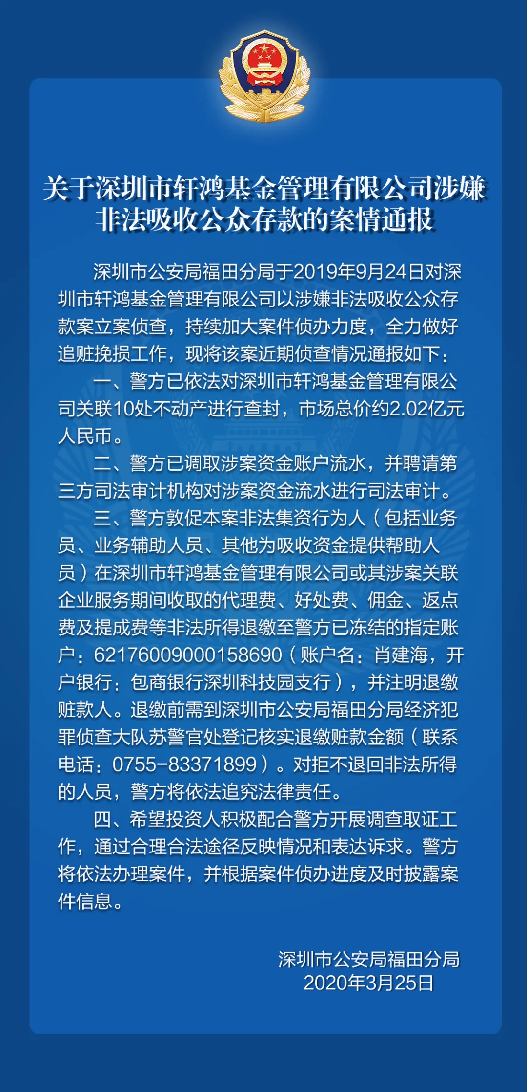 關(guān)于深圳市軒鴻基金管理有限公司、深圳市中展資產(chǎn)管理有限公司涉嫌非法吸收公眾存款的案件情況通報(bào)