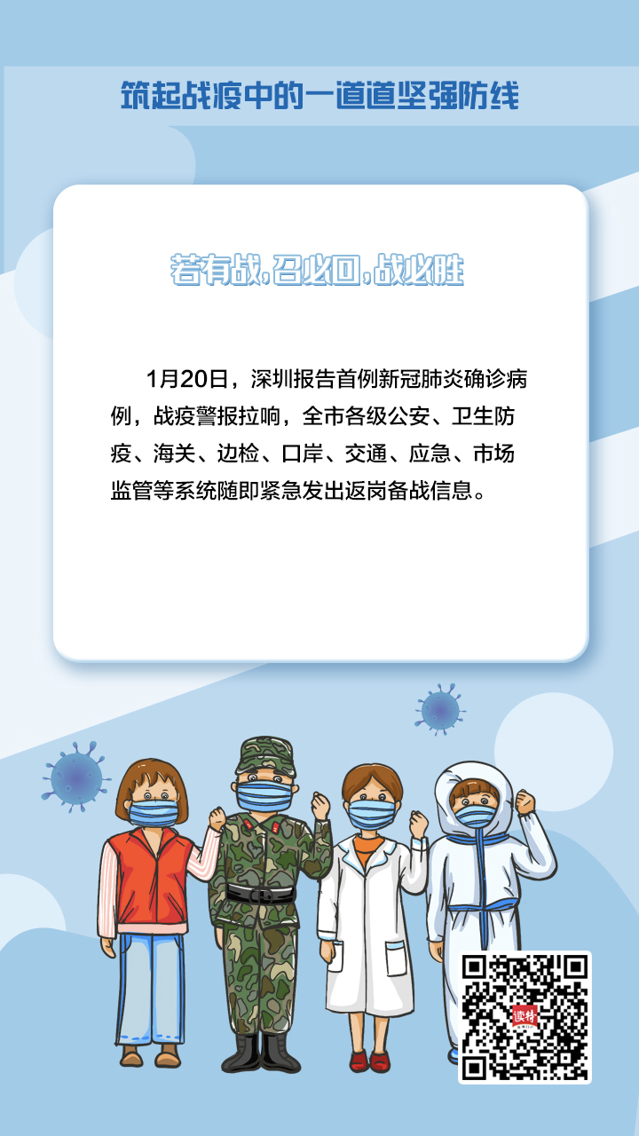 “在深圳的各位同事請立即返崗。各單位請馬上通知休假人員,落實人員歸隊?!?月20日,深圳報告首例新冠肺炎確診病例,戰(zhàn)疫警報拉響,全市各級公安、衛(wèi)生防疫、海關(guān)、邊檢、口岸、交通、應急、市場監(jiān)管等系統(tǒng)隨即緊急發(fā)出返崗備戰(zhàn)信息。