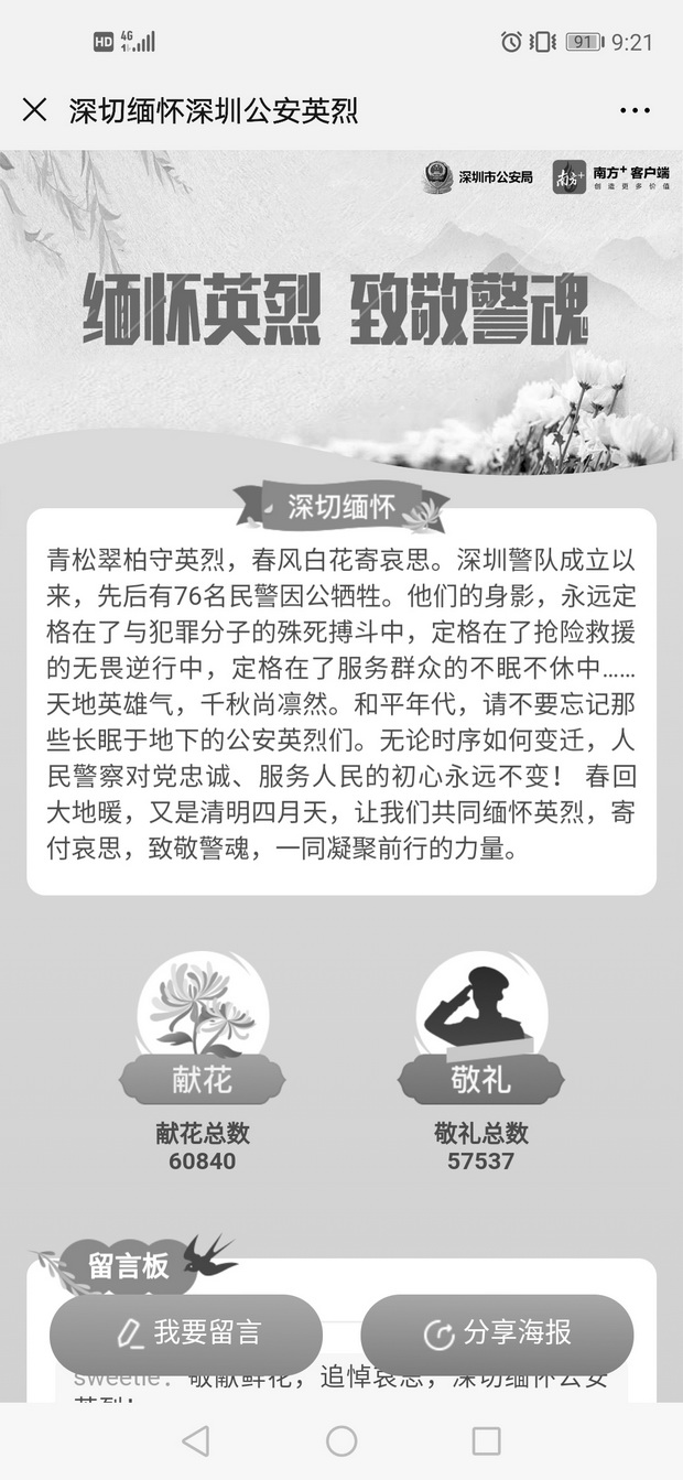 據介紹,鑒于當前疫情防控形勢,市公安局不組織集體祭掃活動,通過公安內網、互聯(lián)網等網絡開設“緬懷英烈”專欄開展“網上祭掃”活動,市民群眾可點擊深圳公安微信公眾號,向公安英烈獻花、留言,寄托哀思,致敬警魂。