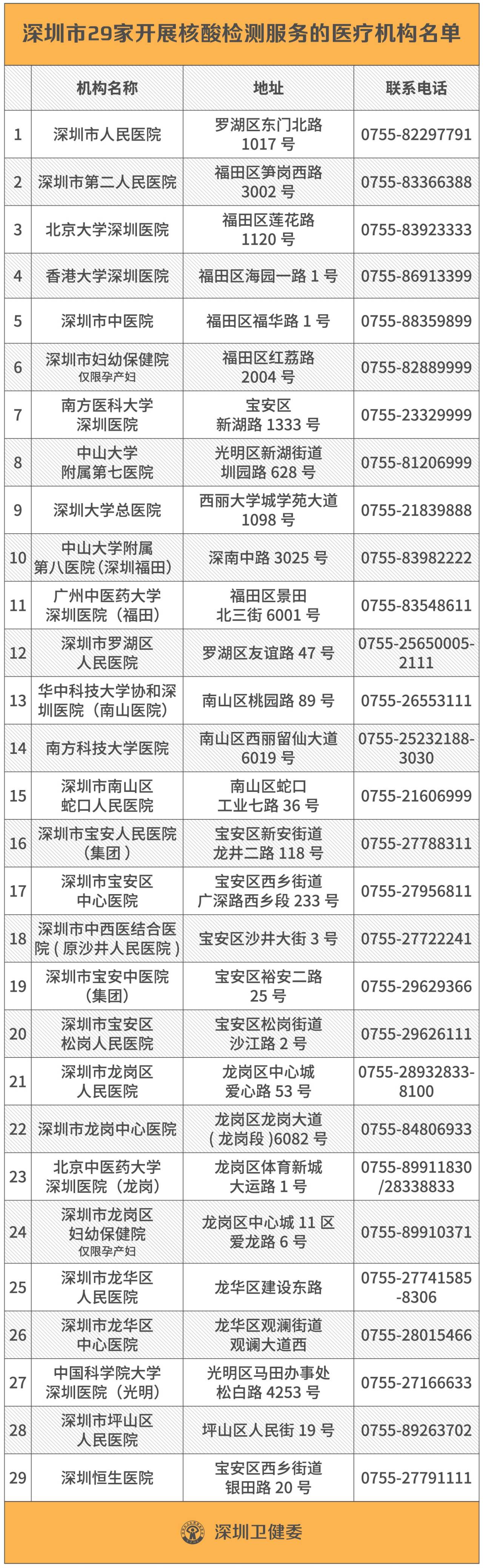 見圳客戶端·深圳新聞網(wǎng)2020年4月9日訊(見圳客戶端、深圳新聞網(wǎng)記者劉夢婷 通訊員深衛(wèi)信)4月8日,武漢解封。但解封不等于解防,為了更好防控新冠肺炎,4月9日,深圳市衛(wèi)健委公布29家面向公眾開展新冠病毒核酸檢測的醫(yī)院名單,如果市民擔心感染新冠肺炎,可前往檢測。