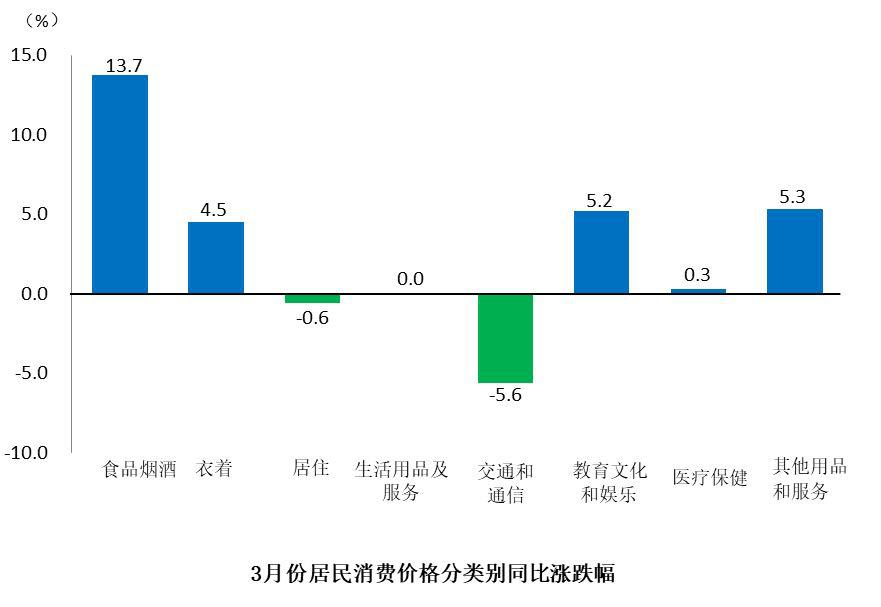 八大類(lèi)商品和服務(wù)同比價(jià)格五升二降一平,食品煙酒價(jià)格上漲13.7%,其他用品和服務(wù)價(jià)格上漲5.3%,教育文化和娛樂(lè)價(jià)格上漲5.2%,衣著價(jià)格上漲4.5%,醫(yī)療保健價(jià)格上漲0.3%;交通和通信價(jià)格下降5.6%,居住價(jià)格下降0.6%;生活用品及服務(wù)價(jià)格持平。