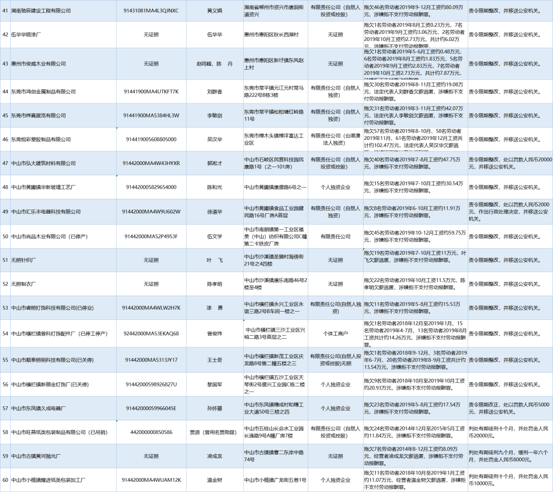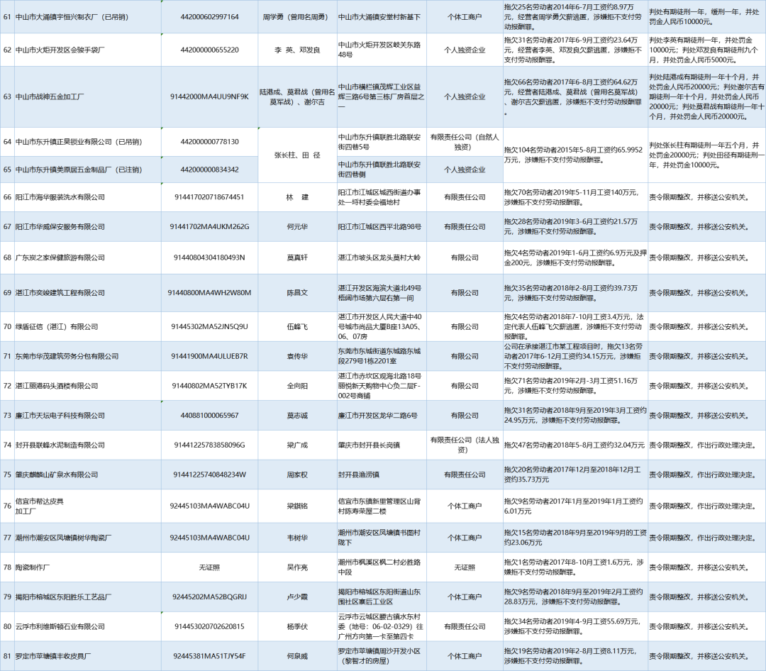 為加強(qiáng)對(duì)違法用人單位的社會(huì)監(jiān)督,強(qiáng)化誠(chéng)信體系建設(shè),加大威懾力,依據(jù)《廣東省用人單位重大勞動(dòng)保障違法行為社會(huì)公布暫行規(guī)定》,省人社廳公布2020年第一批重大違法案件,涉及81家企業(yè),其中深圳豬兼強(qiáng)互聯(lián)網(wǎng)科技有限公司拖欠138名勞動(dòng)者2019年5-6月工資約100.01萬元,涉嫌拒不支付勞動(dòng)報(bào)酬罪,被責(zé)令限期整改,并移送公安機(jī)關(guān)。深港東成睡袋(深圳)有限公司拖欠327名勞動(dòng)者2019年6-7月工資約295.8萬元,涉嫌拒不支付勞動(dòng)報(bào)酬罪,被責(zé)令限期整改,處以罰款人民幣4萬元,并移送公安機(jī)關(guān)。