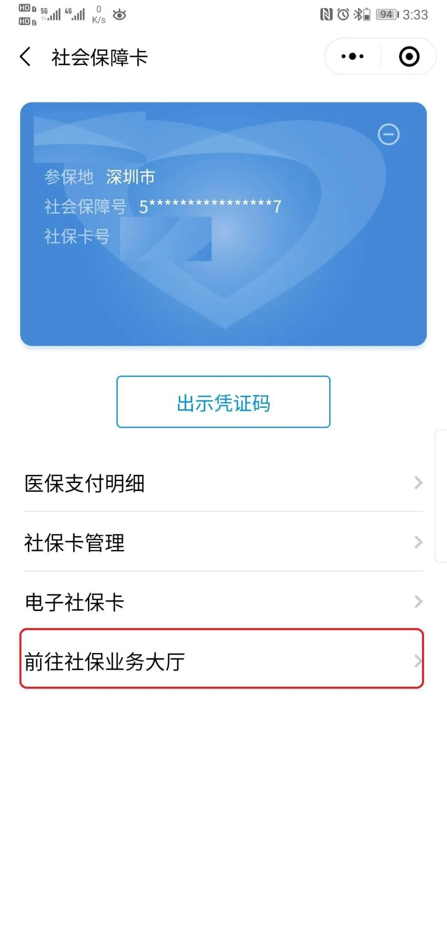 2、添加后點(diǎn)擊進(jìn)入“社會(huì)保障卡”—“前往社保業(yè)務(wù)大廳”;