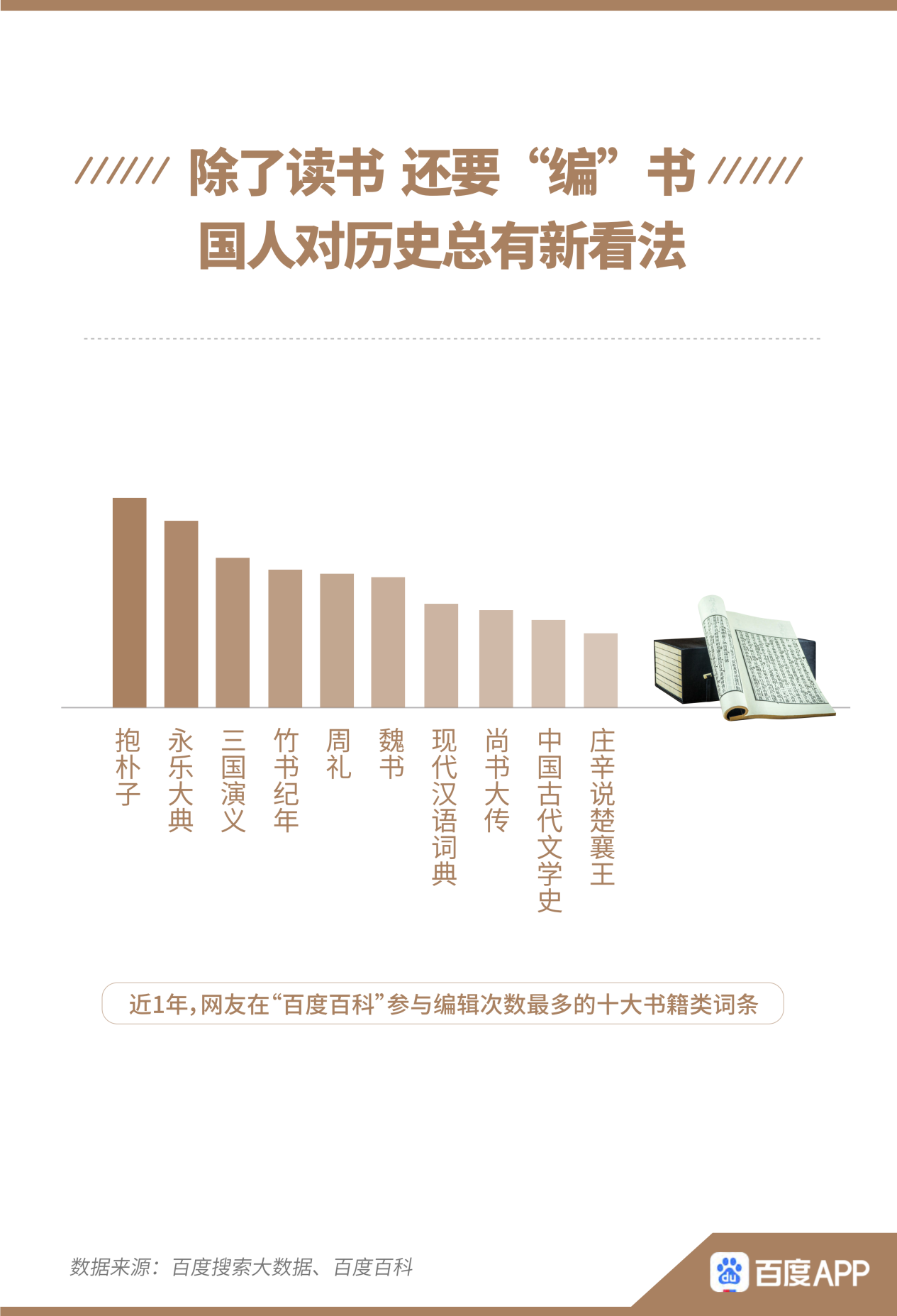不僅讀書,這一屆網(wǎng)友還要“編”書。其中,網(wǎng)友對(duì)歷史著作總有新看法。報(bào)告顯示,近1年,網(wǎng)友在百度百科參與編輯次數(shù)最多的十大書籍類詞條,歷史著作占7席?!队罉?lè)大典》在600年后仍舊“編輯”不停。