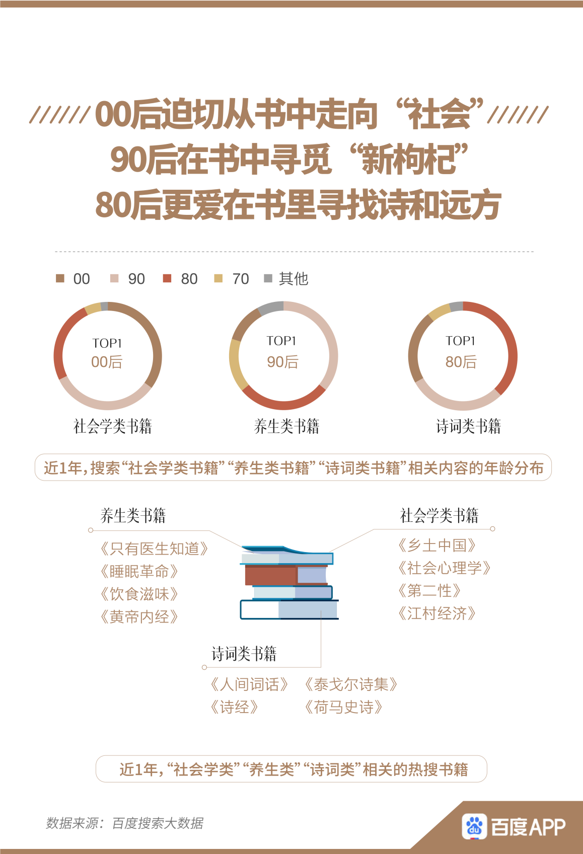除了地區(qū)出現(xiàn)閱讀差異,不同年齡的讀者也有相應(yīng)特征。報(bào)告顯示,00后在閱讀上呈現(xiàn)出對(duì)社會(huì)議題的關(guān)注,是搜索社會(huì)學(xué)類書籍最多的人群。