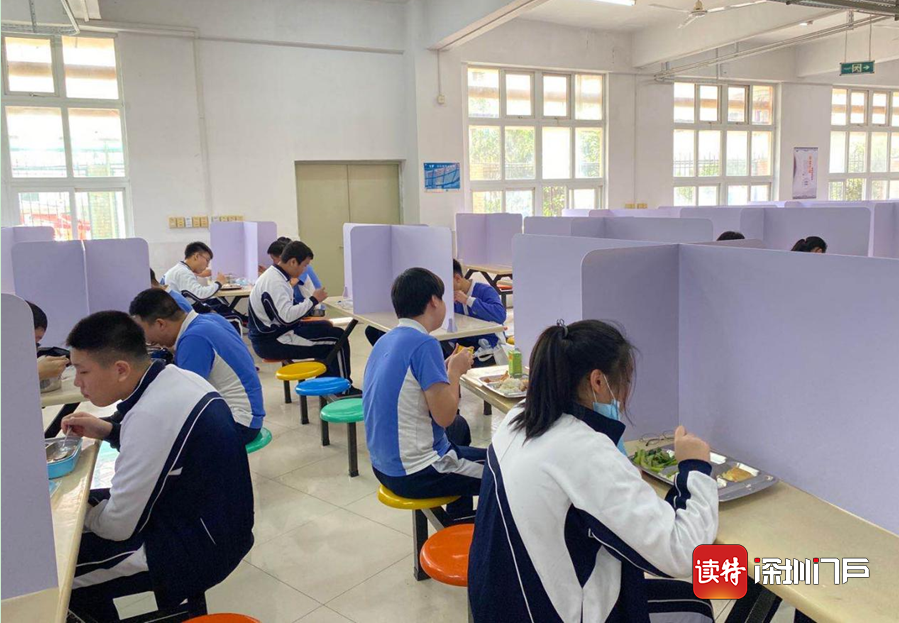 深圳特區(qū)報2020年4月27日訊 4月27日,深圳高三、初三學(xué)子返校。食堂是校園防控工作的重點(diǎn),中午時分,學(xué)生就餐開始,實(shí)行錯峰就餐、分區(qū)就餐。有的學(xué)校將每張餐桌用有機(jī)玻璃隔板分隔用餐區(qū)域,有的學(xué)校在空間足夠的條件下實(shí)行單人單桌,按號就座。