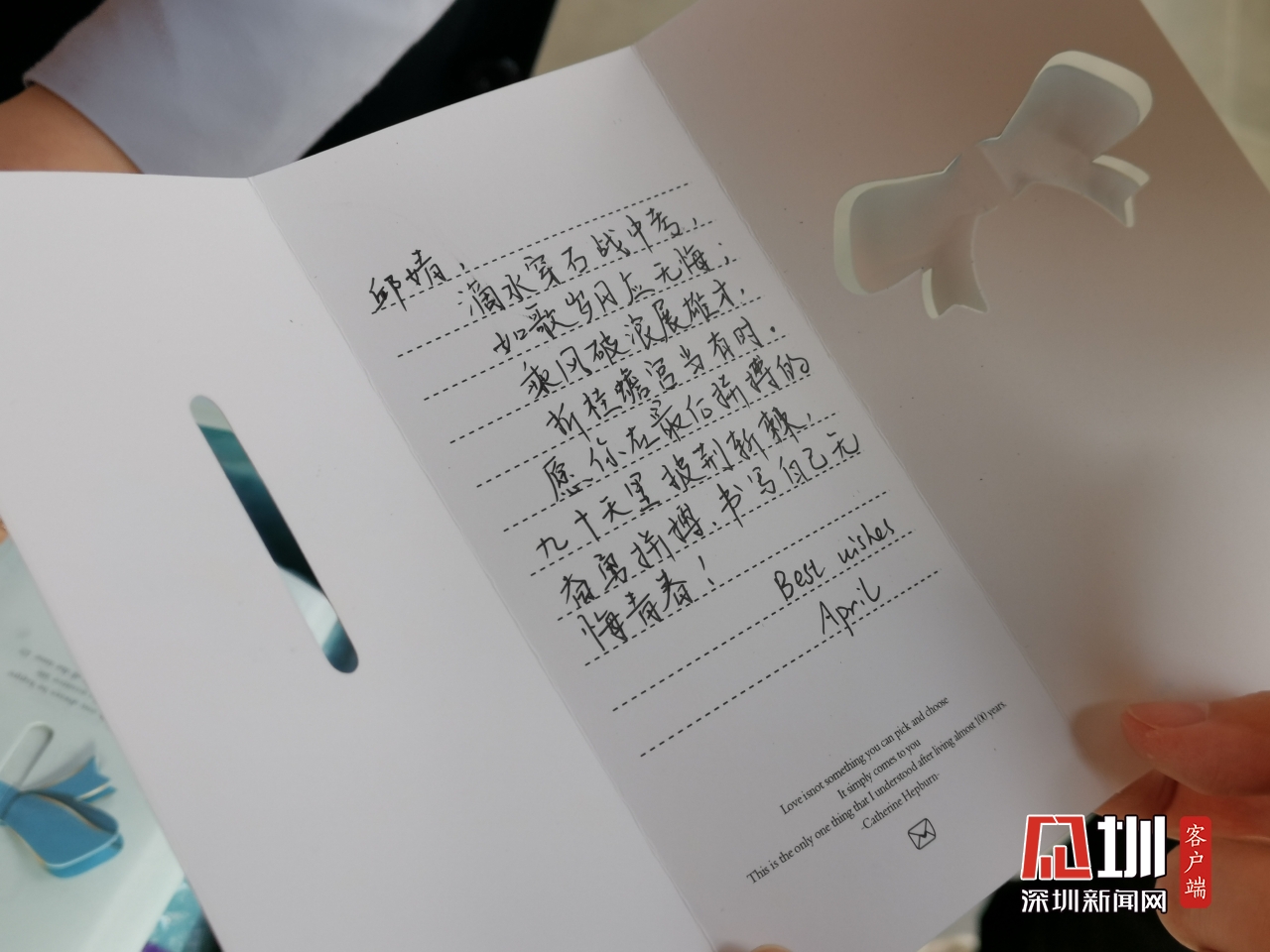 “滴水穿石戰(zhàn)中考,如歌歲月應(yīng)無(wú)悔。乘風(fēng)破浪展雄才,折桂蟾宮當(dāng)有時(shí)。愿你在最后拼搏的九十天里,披荊斬棘,奮勇拼搏,書寫自己無(wú)悔青春?!边@是龍華區(qū)外國(guó)語(yǔ)學(xué)校邱婧同學(xué)收到的老師親筆手寫的激勵(lì)卡,這些充滿力量的鼓舞詞句表達(dá)了畢業(yè)班園丁們對(duì)學(xué)生們的共同祝福與期盼。
