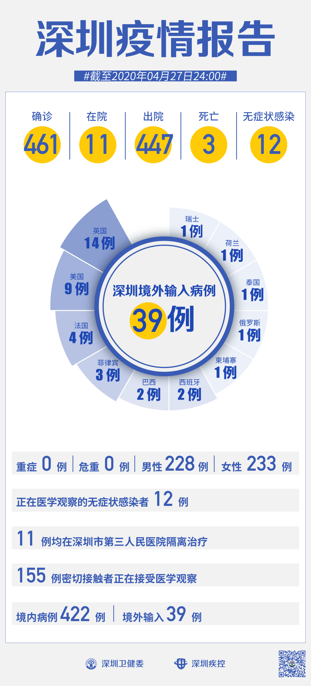 截至4月27日24時(shí),深圳累計(jì)報(bào)告新冠肺炎病例461例。4月27日當(dāng)天新增無癥狀感染者1例,出院1例。