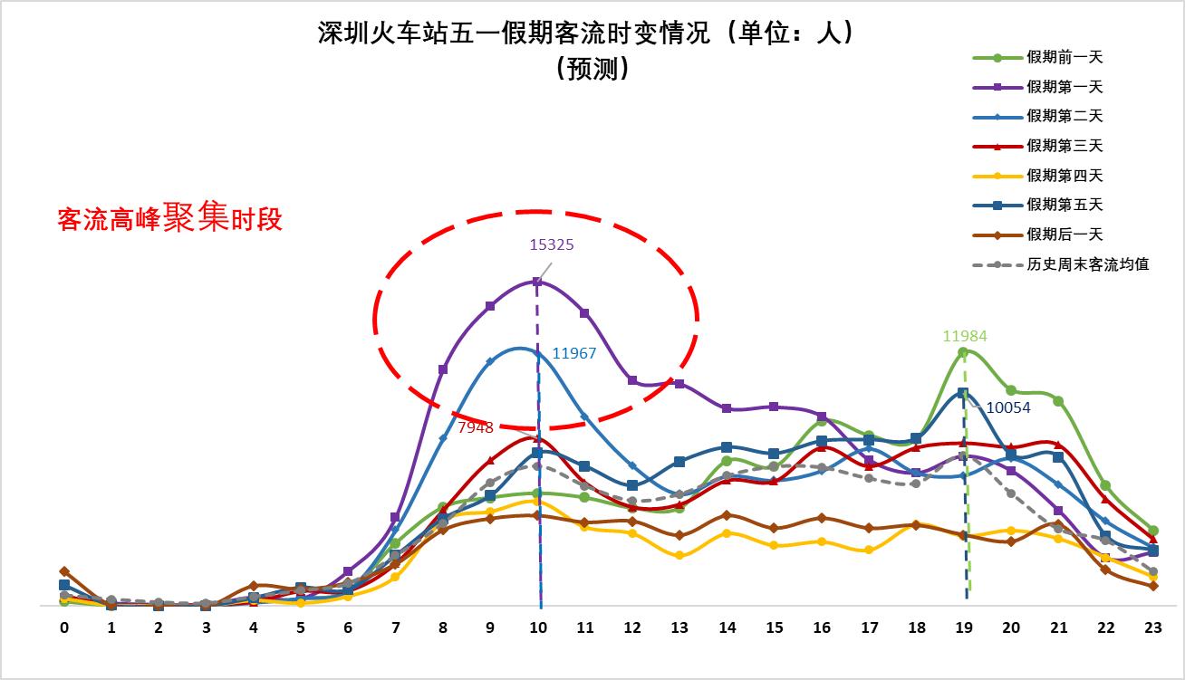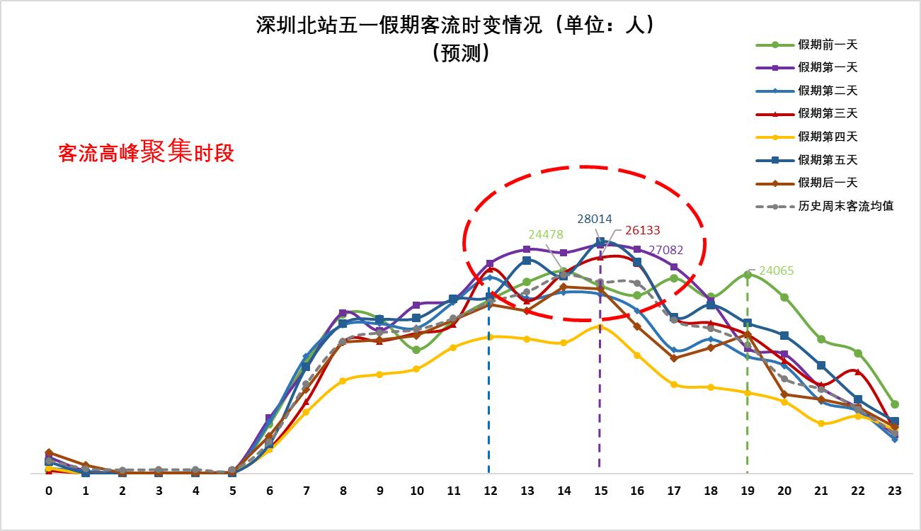 ▲預(yù)計(jì)深圳北站4月30日(假期前一天)晚間時(shí)段較易出現(xiàn)當(dāng)日客流高峰;五一假期期間12:00后較易出現(xiàn)當(dāng)日客流高峰。