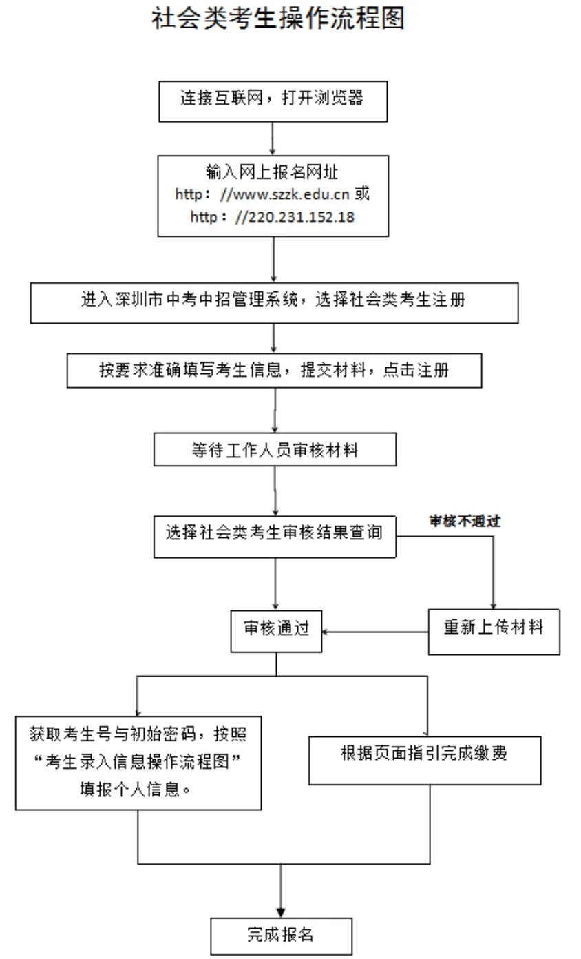 見(jiàn)圳客戶端·深圳新聞網(wǎng)2020年4月30日訊 據(jù)深圳市教育局消息,2020年深圳高中階段學(xué)校招生考試(以下簡(jiǎn)稱“中考”)報(bào)名定于5月6日-15日進(jìn)行,考試時(shí)間為7月20日-21日。 今年本市應(yīng)屆初中畢業(yè)生仍繼續(xù)在就讀學(xué)校集體辦理報(bào)名手續(xù)。符合深圳中考報(bào)名條件的深圳戶籍往屆生、在市外就讀的深圳戶籍應(yīng)屆初中畢業(yè)生(以下簡(jiǎn)稱“社會(huì)類考生”)采用網(wǎng)上報(bào)名方式進(jìn)行報(bào)名。 報(bào)名條件 一、具有我市戶籍的初中畢業(yè)生,可以在我市報(bào)名參加中考。 二、具有我市初三學(xué)籍的隨遷子女可以報(bào)名參加中考,同時(shí)符合以下條件的,可以參加相應(yīng)的公辦普高、民辦普高和中職學(xué)校的劃線錄取。 (一)父親或母親在我市具有合法穩(wěn)定職業(yè); (二)父親或母親在我市具有合法穩(wěn)定住所; (三)父親或母親持有有效《深圳經(jīng)濟(jì)特區(qū)居住證》; (四)父親或母親在我市繳納基本養(yǎng)老保險(xiǎn)及基本醫(yī)療保險(xiǎn),且至少其中一個(gè)險(xiǎn)種累計(jì)繳費(fèi)滿3年,社保累計(jì)年限計(jì)算截至2020年8月31日; (五)隨遷子女在我市具有3年完整初中學(xué)籍。 不符合上述條件但具有我市初中學(xué)籍的隨遷子女,可以在我市參加中考,但僅限于參加民辦普高補(bǔ)錄或中職學(xué)校注冊(cè)入學(xué)。 三、高中階段學(xué)校在校生不得報(bào)名。 本市應(yīng)屆初中畢業(yè)生報(bào)名辦法 本市應(yīng)屆初中畢業(yè)生于5月6日至7日在就讀學(xué)校集體辦理報(bào)名手續(xù)。 今年中考繼續(xù)實(shí)行網(wǎng)上報(bào)名。要求各學(xué)校開(kāi)放計(jì)算機(jī)房,為本??忌暇W(wǎng)報(bào)名提供方便。 5月8日至15日,學(xué)校組織考生進(jìn)行電子攝像,學(xué)校和考生分別上網(wǎng)錄入報(bào)名信息,考生錄入信息可參考“考生錄入信息流程圖”進(jìn)行操作。 市教育局強(qiáng)調(diào),學(xué)校不得以任何理由拒絕有本校學(xué)籍的應(yīng)屆畢業(yè)生報(bào)考(參加中職學(xué)校自主招生、注冊(cè)入學(xué)的考生,也須報(bào)名參加中考)。如有違反者,將嚴(yán)肅查處,并追究相關(guān)人員責(zé)任。同時(shí)要求各區(qū)有關(guān)職能部門(mén)、各有關(guān)學(xué)校(報(bào)名點(diǎn))要嚴(yán)格審查報(bào)名材料。對(duì)不符合報(bào)名條件、弄虛作假而被錄取的考生,一經(jīng)發(fā)現(xiàn),取消其錄取資格;已經(jīng)到錄取學(xué)校報(bào)到注冊(cè)的,取消其學(xué)籍,并追究相關(guān)人員責(zé)任。 社會(huì)類考生報(bào)名辦法 社會(huì)類考生采用網(wǎng)上報(bào)名方式進(jìn)行報(bào)名。報(bào)名考生需在5月6日至15日登錄報(bào)名網(wǎng)址(http://www.szzk.edu.cn/),按照提示進(jìn)行網(wǎng)上注冊(cè),上傳報(bào)名審核資料,由考生戶籍所在區(qū)社會(huì)報(bào)名點(diǎn)進(jìn)行線上審核,審核通過(guò)后系統(tǒng)將生成中考考生號(hào)及初始密碼,考生需用獲取的考號(hào)及密碼登錄中考中招管理系統(tǒng),填寫(xiě)個(gè)人信息,具體操作可參考“考生錄入信息流程圖”。同時(shí)需在報(bào)名截止前根據(jù)指引完成網(wǎng)上繳費(fèi)。 若考生網(wǎng)上報(bào)名審核不通過(guò),需按照系統(tǒng)的不通過(guò)原因提示,重新補(bǔ)充審核資料,如多次上傳資料失敗或?qū)徍瞬煌ㄟ^(guò),考生可撥打戶籍所在區(qū)的社會(huì)報(bào)名點(diǎn)電話進(jìn)行咨詢或電話預(yù)約,按照工作人員指示進(jìn)行操作報(bào)名,不要在未預(yù)約的情況下前往社會(huì)報(bào)名點(diǎn),盡量避免出行,減少人員聚集。 社會(huì)類考生操作流程如下圖: