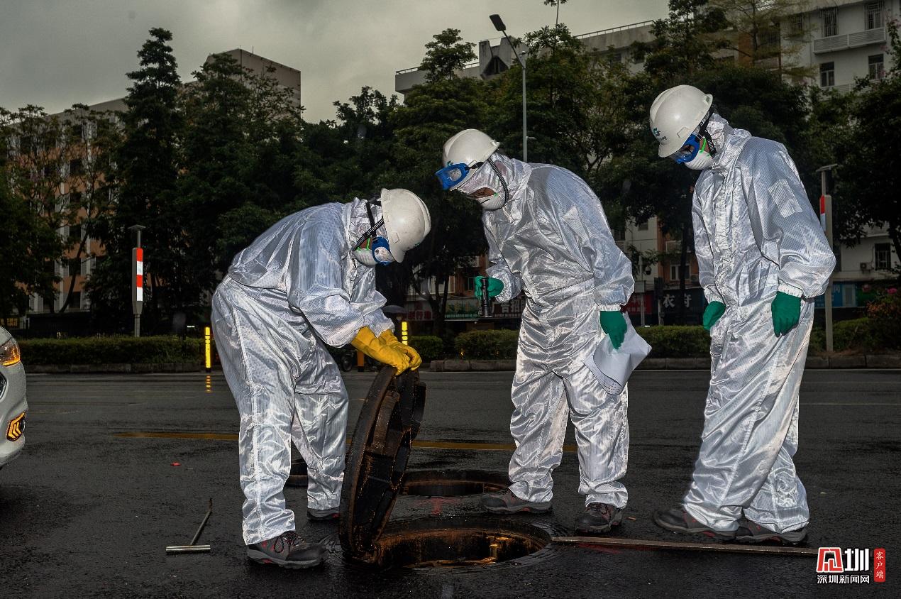 福田分公司巡查工張憶浩、吳暉雄和羅寶斌,正對(duì)福中路的排水管網(wǎng)進(jìn)行細(xì)致排查。身后的烏云,與他們白色的防護(hù)服形成鮮明對(duì)比。