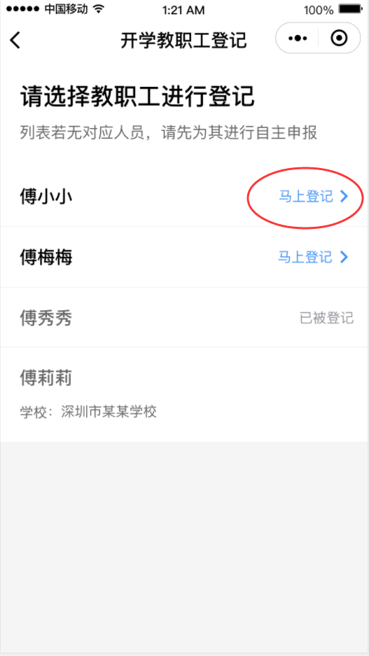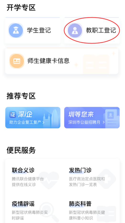 ①在首頁開學(xué)專區(qū),點擊“教職工登記”進入申報人員列表,進行自主申報和實名認(rèn)證。