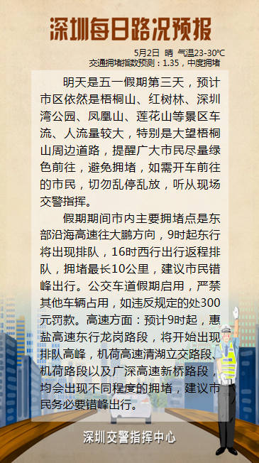 由于市民出行意愿較強(qiáng)烈,預(yù)計明日市內(nèi)熱門商圈、景區(qū)、公園的車流量壓力仍較大,大鵬、鹽田等濱海景區(qū)車流量將會持續(xù)增加。