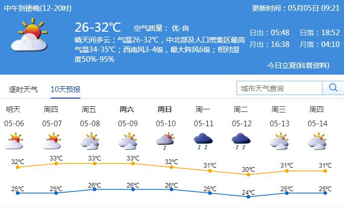 見圳客戶端·深圳新聞網(wǎng)2020年5月5日訊 深圳市氣象臺預(yù)計(jì),5日我市晴天間多云,氣溫25℃-32℃,中北部和人口密集區(qū)最高氣溫34℃-35℃;6-9日多云間晴天,天氣炎熱,午后局地有熱雷雨;10-11日受冷空氣影響,有雷陣雨。